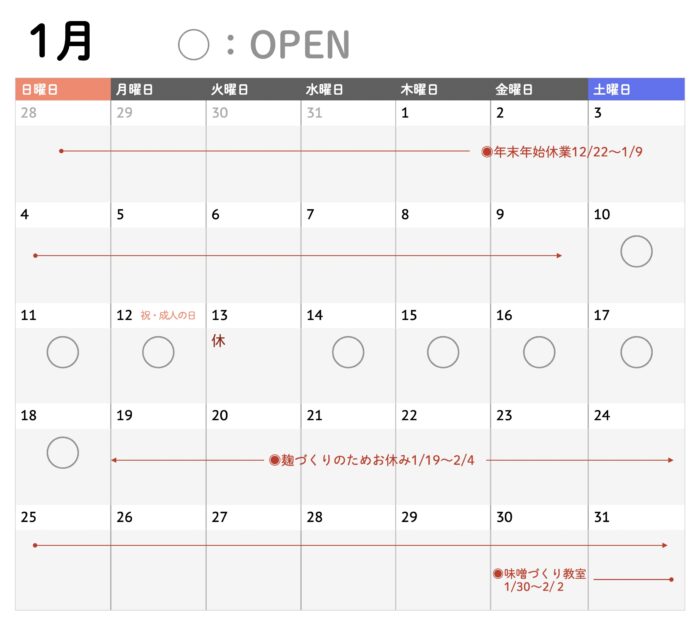 †. お知らせ 1月の店営業は終了しました。通常営業は2月11日(水)以降の予定です。決まり次第のお知らせとなります。味噌づくり教室は1月30日からの4日間です。