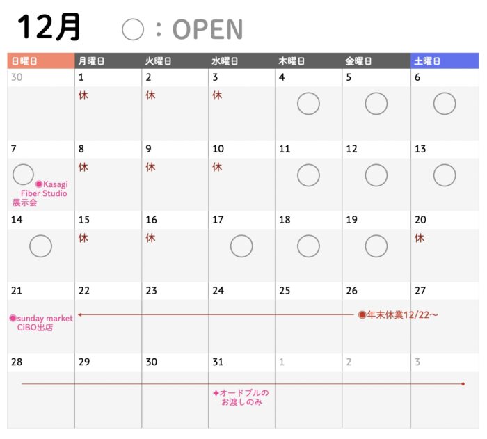 ◎12月のカフェとランチ 休日中も電話対応は可能ですので、ご予約などお問い合わせくださいませ。状況などFACEBOOK、INSTAGRAM(ストーリーズ)、でも告知いたします。 ◎オードブルのご注文 通常、オードブルやお弁当のご注文は、お野菜などの仕入れ、仕込み準備のため5日前くらいまででお受けしております。なお、effe-co.との年末コラボオードブルについては、予定数に達し次第締め切らせていただきます。 ◎12月のギャラリー 12/7の13時〜15時半、短い時間ですがKasagi Fiber Studioの展示会です。羊毛ソックスについては12月1月は常設販売です。