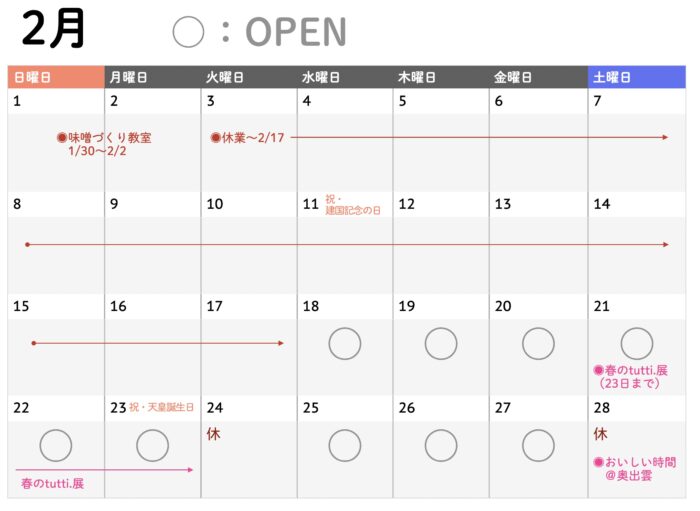 ◎2月のカフェとランチ 休日中も電話対応は可能ですので、ご予約などお問い合わせくださいませ。状況などFACEBOOK、INSTAGRAM(ストーリーズ)、でも告知いたします。 ◎オードブルのご注文 通常、オードブルやお弁当のご注文は、お野菜などの仕入れ、仕込み準備のため5日前くらいまででお受けしております。 ◎2月のギャラリー 21日(土)からの3日間、春のtutti展開催です。