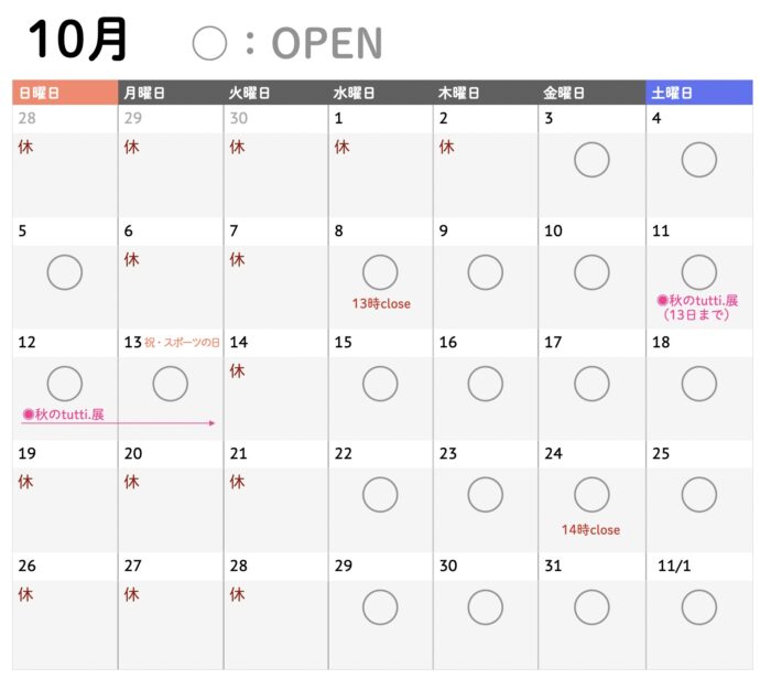 ◎10月のカフェとランチ 休日中も電話対応は可能ですので、ご予約などお問い合わせくださいませ。状況などFACEBOOK、INSTAGRAM(ストーリーズ)、でも告知いたします。 ◎オードブルのご注文 通常、オードブルやお弁当のご注文は、お野菜などの仕入れ、仕込み準備のため5日前くらいまででお受けしております。 ◎10月のギャラリー 11日〜13日の3日間、秋のtutti.展開催です。